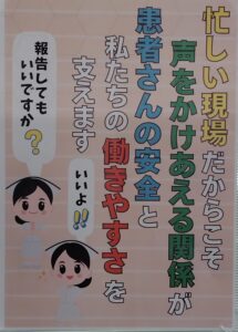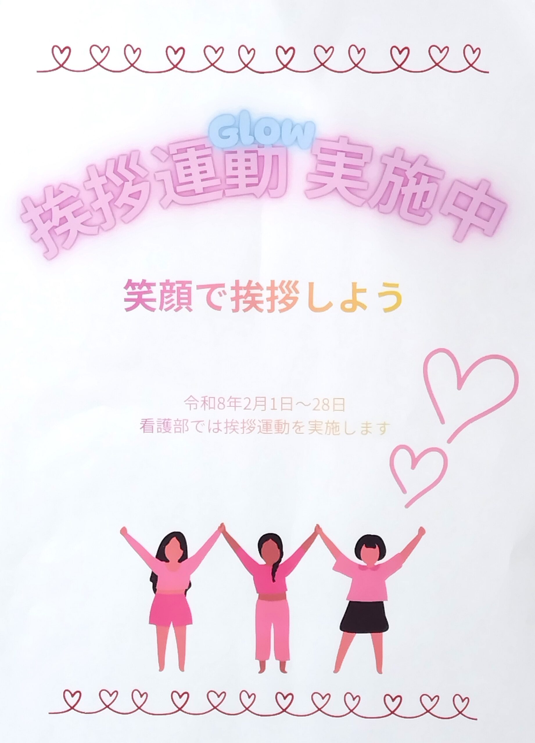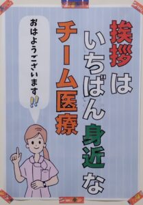 開始するにあたり、院内の職員が利用する休憩室やロッカー、トイレなどにメッセージポスターを掲示しています。早速「ポスター見たよ、挨拶運動いいね!」という大きく明るい声が聞かれました。