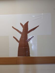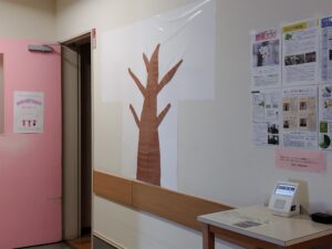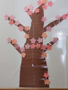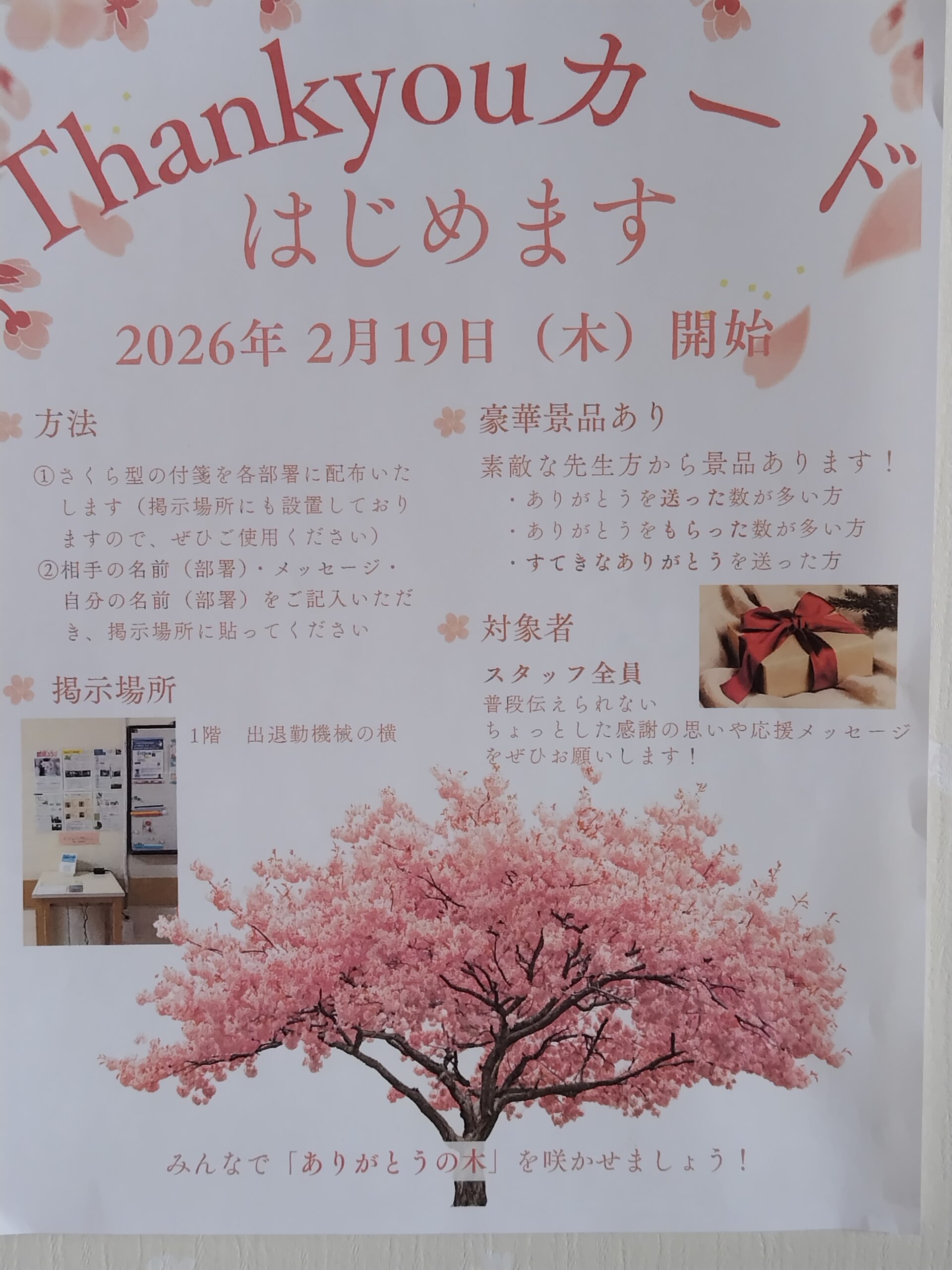 2月19日から担当係長らが主となって「Thankyouカード」という活動を始めました。普段伝えられない感謝や、ちょっとした何気ない思いを他者に伝えるための活動です。方法は簡単。桜の木に見立てた壁に貼ってある「木」に、花の形の付箋にメッセージを書いて貼るというものです。もちろん付箋は「花びら🌸」に模しています。