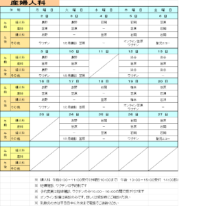 産婦人科外来2月分の診療体制は下表のとおりです。