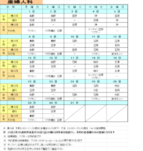 産婦人科外来12月分の診療体制は下表のとおりです。