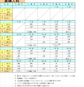 産婦人科外来1月分の診療体制は下表のとおりです。